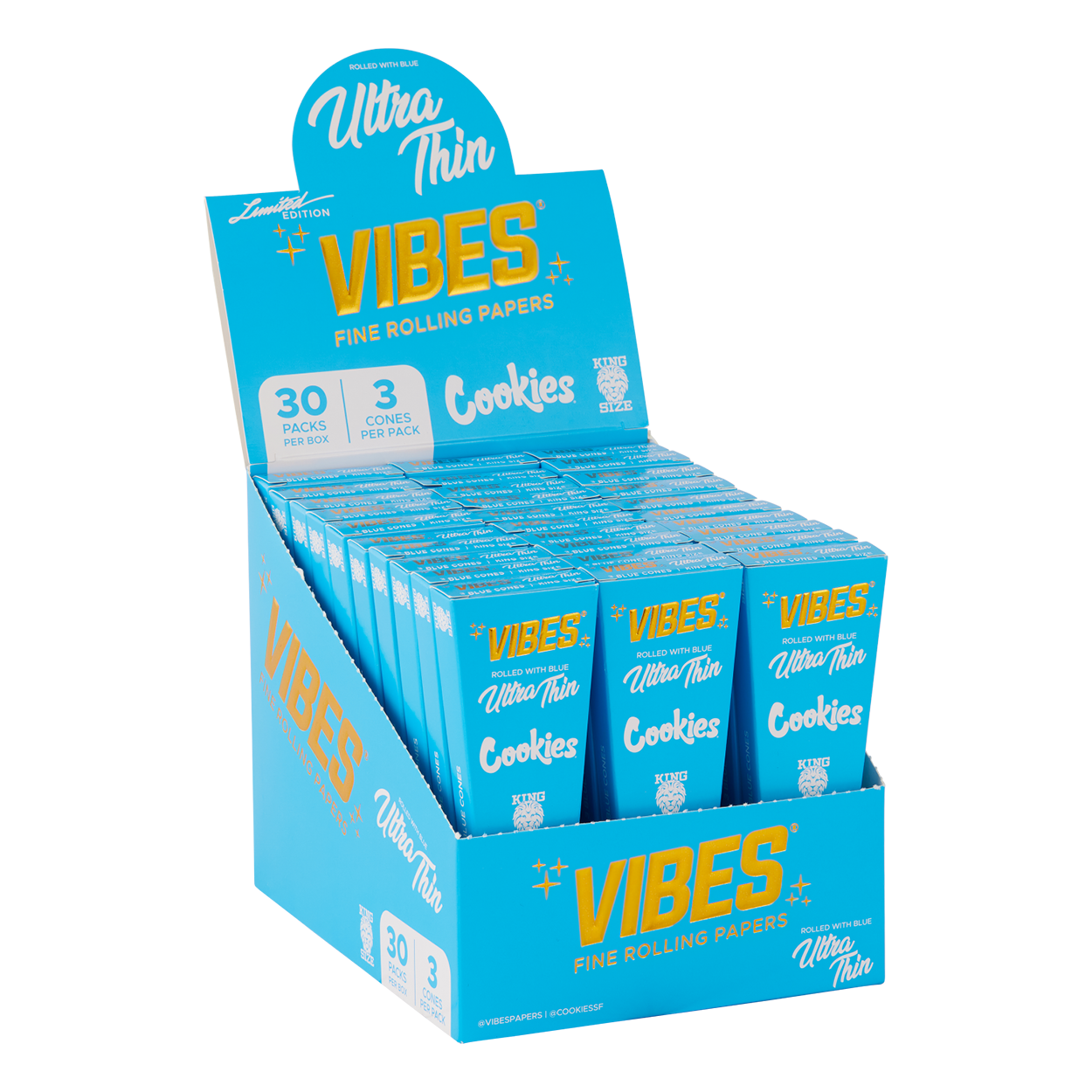 The blue King Size Slim Vibes x Cookies limited edition Cones are hand-rolled and made from our best-selling, ultra-thin, wood pulp paper blend to deliver a consistent and slow burn. When using our Ultra Thin paper you’ll experience more of your material’s smoke, as opposed to the “paper smoke” of the cone.